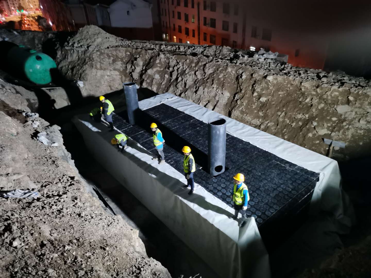 該項目雨水回收系統采用地埋PP模塊組合水池的方式收集雨水,前期經過截污掛籃、棄流過濾,后期通過地埋一體機過濾,消毒,最終使水質達到規范標準,用于廠區綠地的澆灑,景觀補水,道路沖洗。