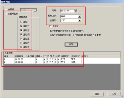 進行定時任務設置,添加兩個定時任務,設置完畢后 到 [總控制臺] 上傳設置,注意上傳完畢后,由于還沒有到啟動定時任務的時間,所以門的系統還是保持在線狀態.